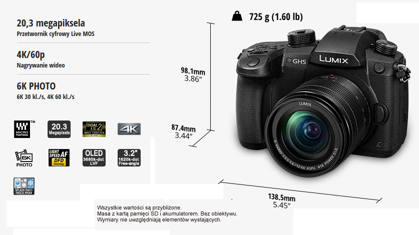 Aparat Panasonic DC-GH5 oferuje zaawansowane możliwości dzięki zastosowaniu wysokowydajnego cyfrowego przetwornika obrazu Live MOS o rozdzielczości 20,3 megapikseli, który zapewnia najwyższą jakość obrazu w całej historii aparatów cyfrowych LUMIX G. Aparat Panasonic DC-GH5 to aparat cechujący się niezwykle stylowym wyglądem, który został stworzony przez firmę Panasonic na podstawie sugestii przekazywanych przez użytkowników.