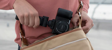 bezlusterkowiec z wymiennymi obiektywami. Kiedy trzymasz uchwyt w ręku,